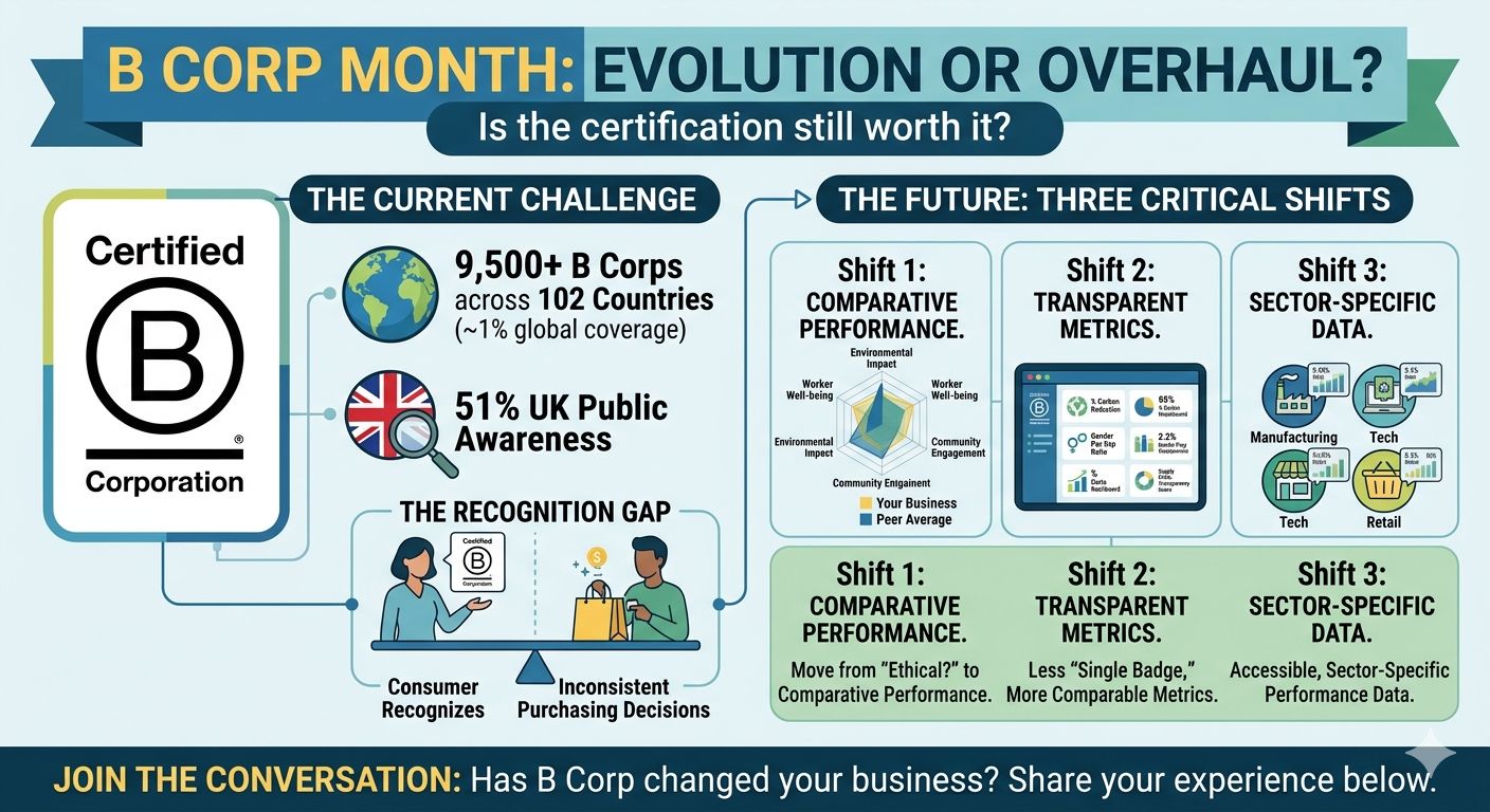 This is the first B Corp Month after the standards overhaul. This redesign is in response to accusations of greenwashing, uneven standards and public non-renewal exits by purpose‑led businesses like Scrumbles and Dr. Bronner's.